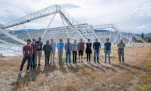 Some members of the CHIME/FRB Collaboration, in front of CHIME in 2019. Courtesy: Andre Renard, Dunlap Institute.