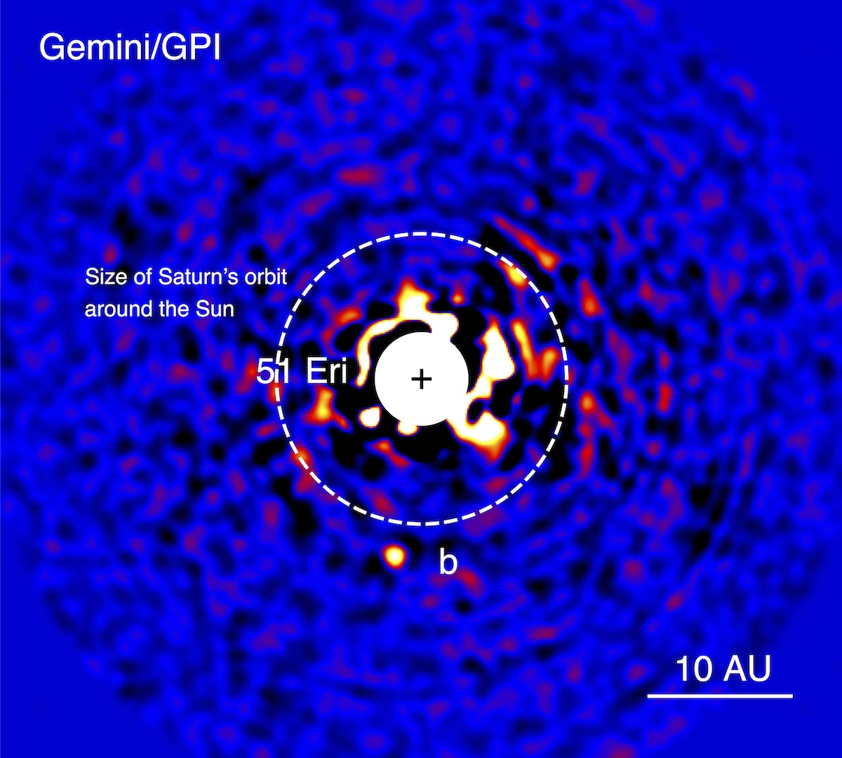 Discovery image of the planet 51 Eridani b with the Gemini Planet Imager taken in the near-infrared light on December 18 2014. The bright central star has been mostly removed to enable the detection of the exoplanet one million times fainter. Image: J. Rameau (UdeM) and C. Marois (NRC Herzberg)