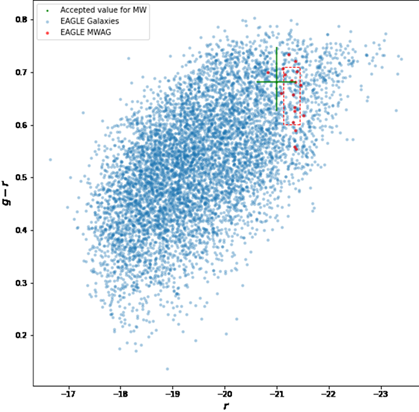A plot showing the colour of the Milky Way (green) and our Analogues (red) against the other galaxies in the simulation (blue). Credit: Alicia Savelli.