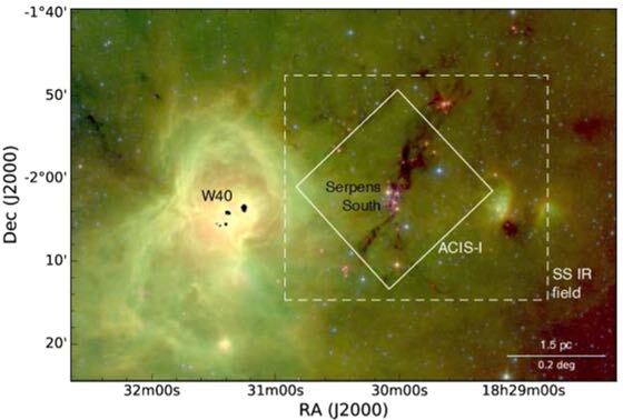 Spritzer IRAC and MIPS three-colour image of Serpens South and W40 region. Inner box is Chandra ACIS-I field of view, outer dashed boxes Serpens South IR field. Credit: Winston, E., et al.