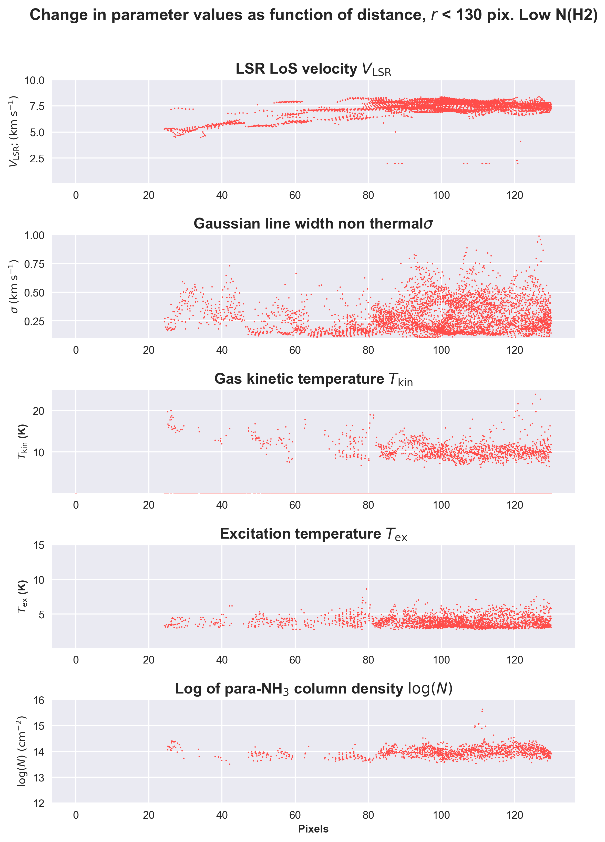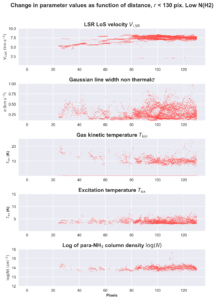 The change in parameters as a function of distance from what we believe to be the centre of the W40 complex, an O star designated as IRS 1A South with coordinates (18h31m27.83s, -02d05m23.61s). Credit: Ian Niebres.