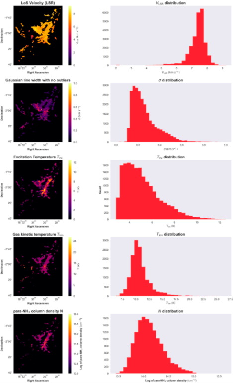 These are plots of the maps of various parameters of the W40 and Serpens South region as well as their distributions. Credit: Ian Niebres.