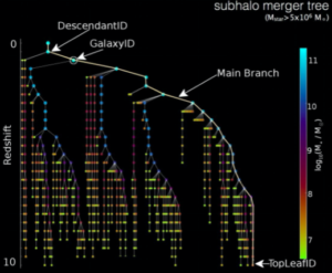 A visual of galaxy mergers. Each node is a galaxy that combines with the other nodes to make larger galaxies, eventually leading to one big galaxy (analogous to rivers merging until they combine into an ocean. Credit: (McAlpine et al. 2016)