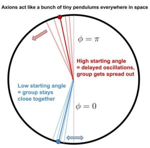 Axions can be thought of as a bunch of pendulums oscillating everywhere in space. How close the pendulums start to the very top determines how spread out they become. Credit: Harrison Winch.