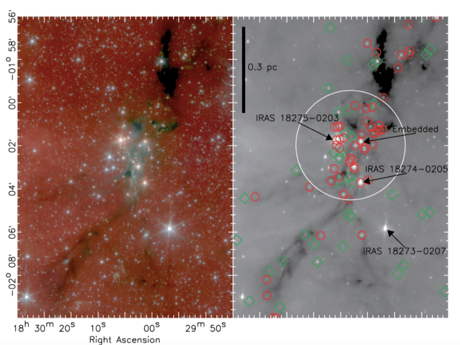 Colour composite image of the Spitzer IRAC mosaics of Serpens South. Red circles are Class I protostars, and green diamonds are Class II stars with disks. The white circle marks the dense core of the cluster. Credit: Gutermuth et al (2008).