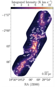 Ammonia emission from Serpens South. Locations of the dense cores are outlined in white. Credit: Emma Jarvis.